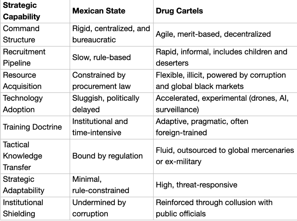The Zetas—originally composed of elite military defectors—pioneered the integration of advanced tactical warfare into cartel strategy. Now CJNG and others emulate this structure, employing encrypted communications, explosive drones, paramilitary formations, and decentralized command cells (ACLED, 2025; BBC, 2024). Meanwhile, Mexico’s state response remains bogged down in bureaucracy and slow institutional reflexes.