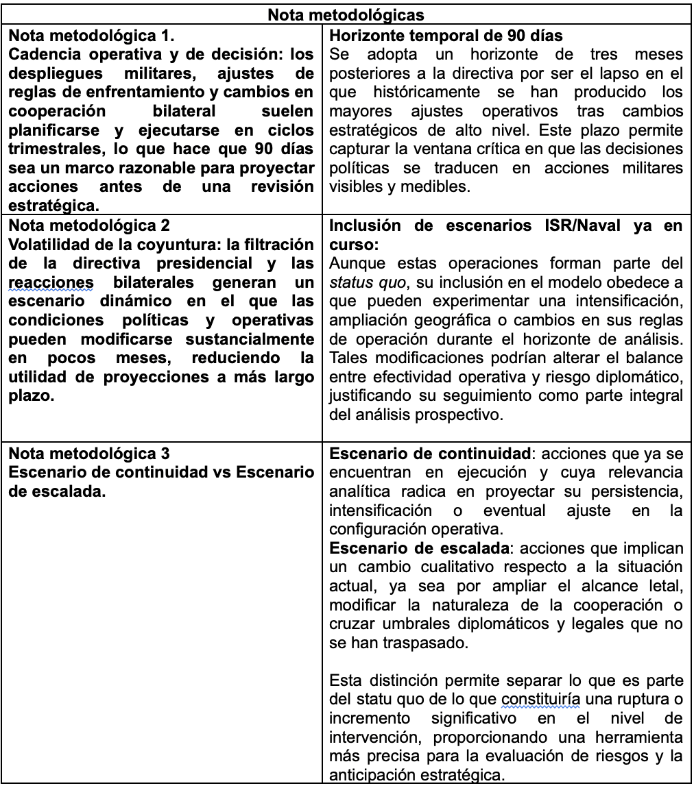 El horizonte de análisis se establece en 90 días por ser el periodo en el que se concentran las mayores probabilidades de materialización de cambios operativos tras la emisión de la directiva, en función de precedentes históricos y del ritmo observado en despliegues recientes. Este marco temporal también permite medir la evolución de escenarios ya en ejecución —como las operaciones ISR y navales— que, aunque forman parte del status quo, podrían intensificarse o transformarse de manera significativa, generando impactos operativos y diplomáticos que justifican su inclusión en el modelo.