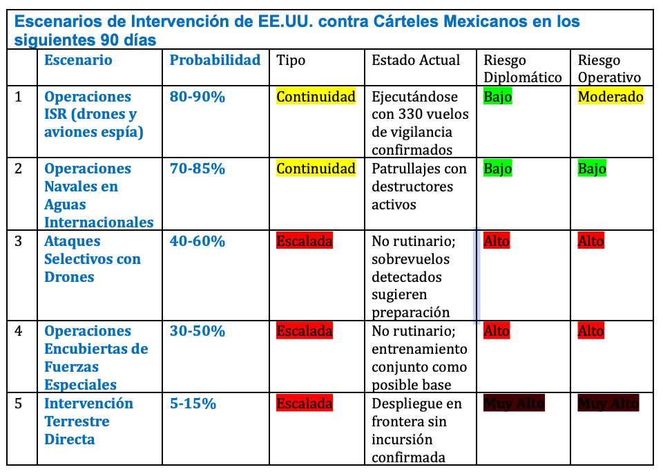 Con base en la cronología de eventos (20 de enero al 9 de agosto de 2025) y el análisis metodológico, se presentan los escenarios probables para la intervención de EE.UU. contra los cárteles mexicanos, ordenados por viabilidad y clasificados como de continuidad o escalada.