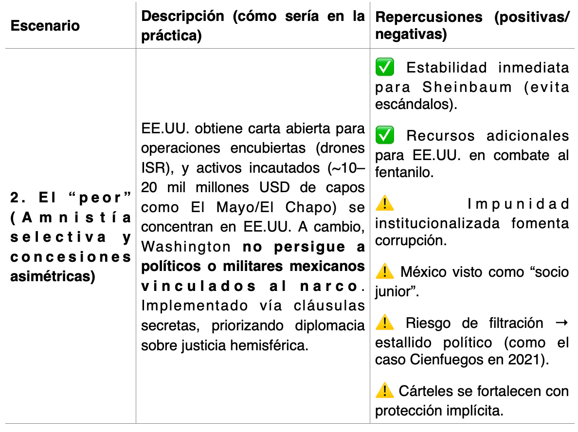 Basado en precedentes como Mérida (2008-2021), que evolucionó de asistencia unilateral a cooperación, y riesgos políticos de 2025 (e.g., revisión USMCA, elecciones intermedias en México), aquí cuatro escenarios realistas. Incluyo el "peor" presentado (amnistía selectiva) y uno adversarial donde EE.UU. persigue actores políticos mexicanos. Cada uno analiza hechos subyacentes (e.g., datos de extradiciones, flujos financieros) y repercusiones.