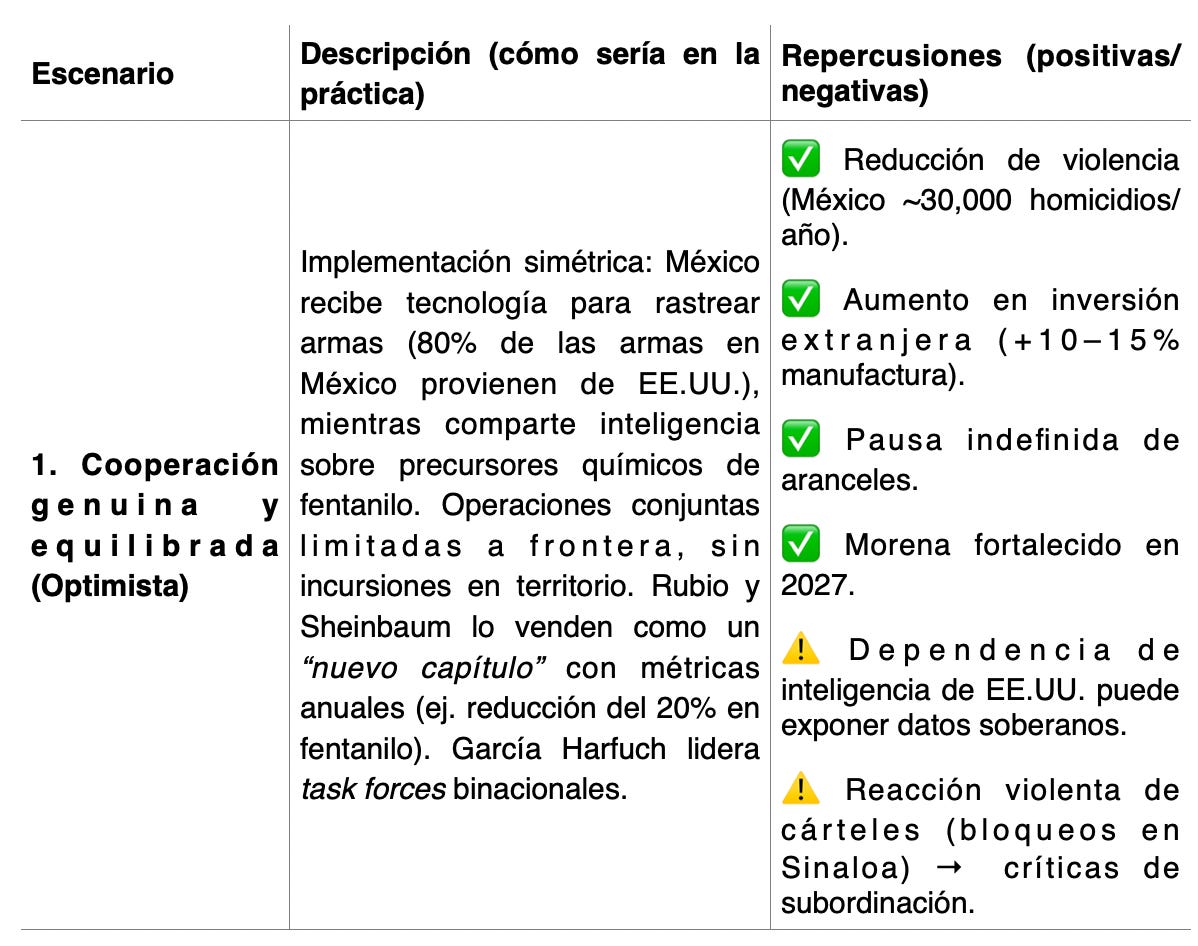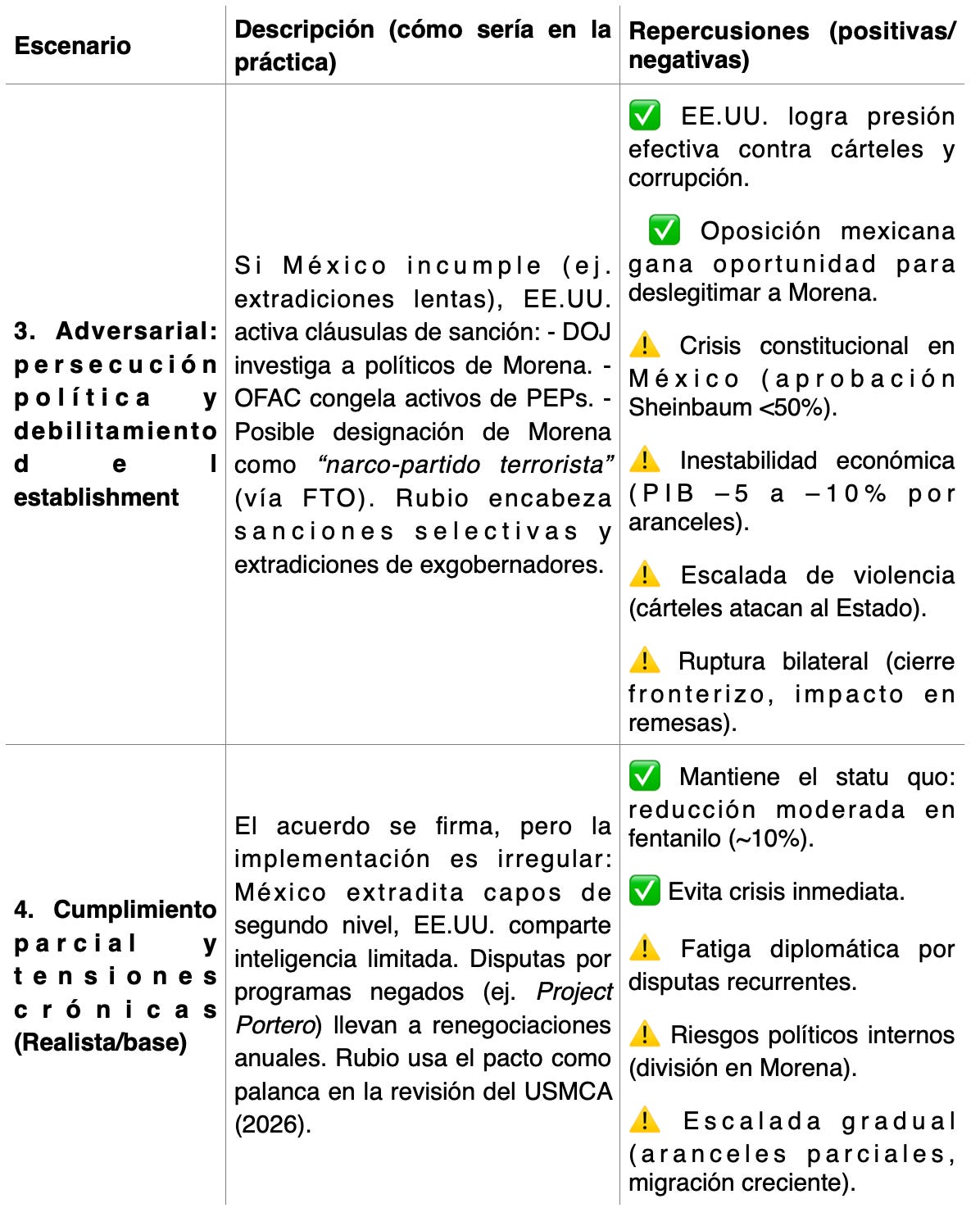 ④ El riesgo es que, más allá de la narrativa de “cooperación mutua”, cada incumplimiento active las cláusulas duras (escenario 3), llevando a una crisis política de régimen en México.