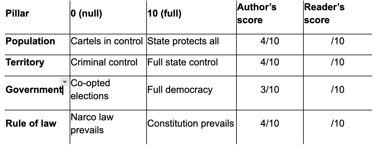 Estimated 2025 result: about 15 out of 40 points. Mexico is not without sovereignty, but exercises it in an eroded, fragmented, and contested fashion.
