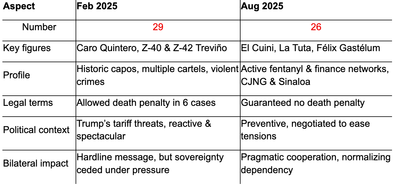 February 2025: 29 extradited, including Rafael Caro Quintero and Los Zetas’ Treviño brothers. For the first time, Mexico allowed six cases to face possible death penalty in the U.S.—a rupture with tradition. Context: Trump threatened 25% tariffs.