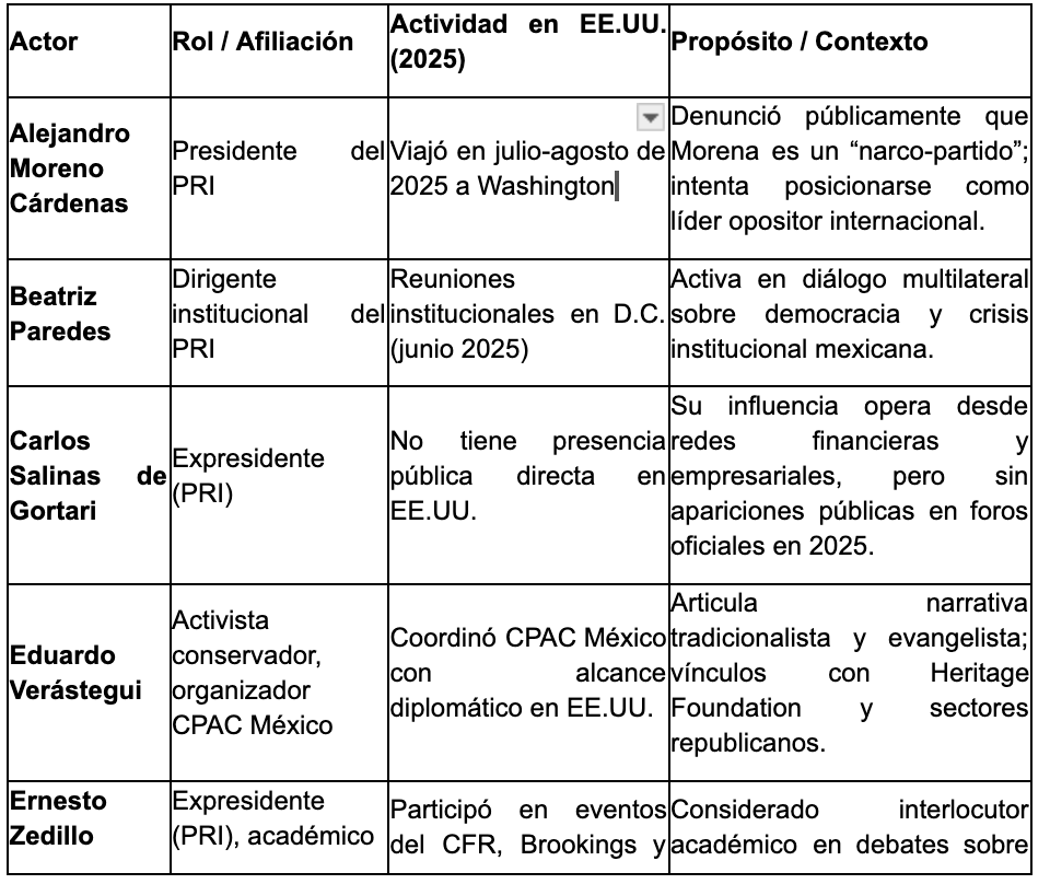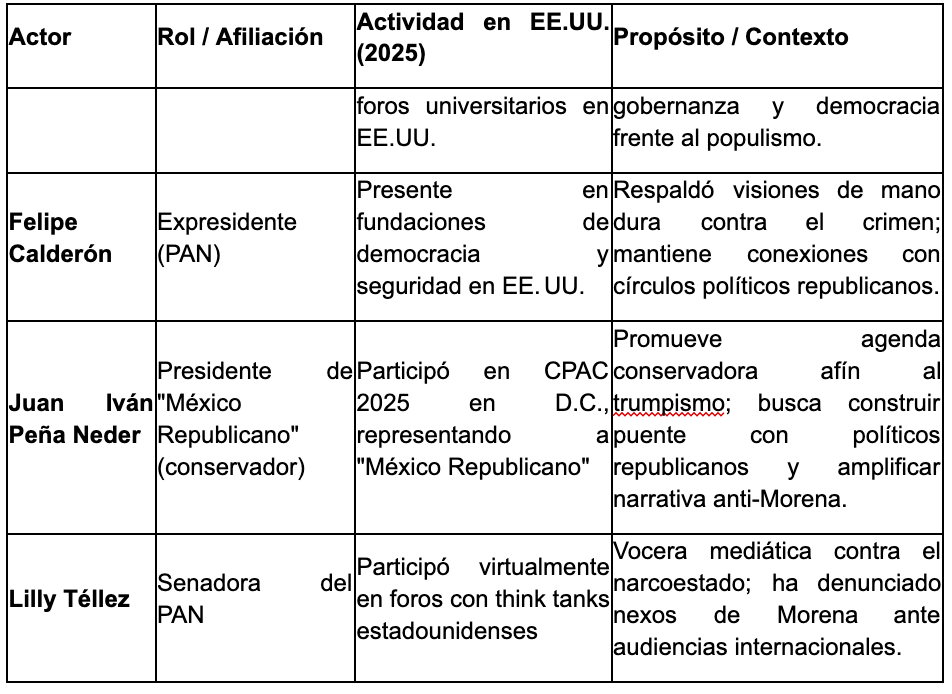 En este contexto, Washington emerge como un punto de encuentro operativo y simbólico. Allí confluyen agendas conservadoras, redes diplomáticas, think tanks y actores legislativos estadounidenses dispuestos a escuchar, amplificar o incluso operar con estos nuevos bloques opositores mexicanos. Lo que se perfila no es una coalición tradicional, sino una amalgama bilateral, con centros de gravedad paralelos: uno en territorio mexicano y otro en el circuito de influencia política en EE.UU..