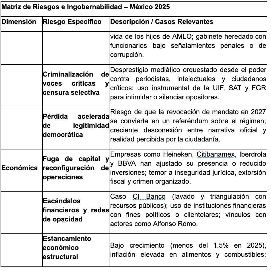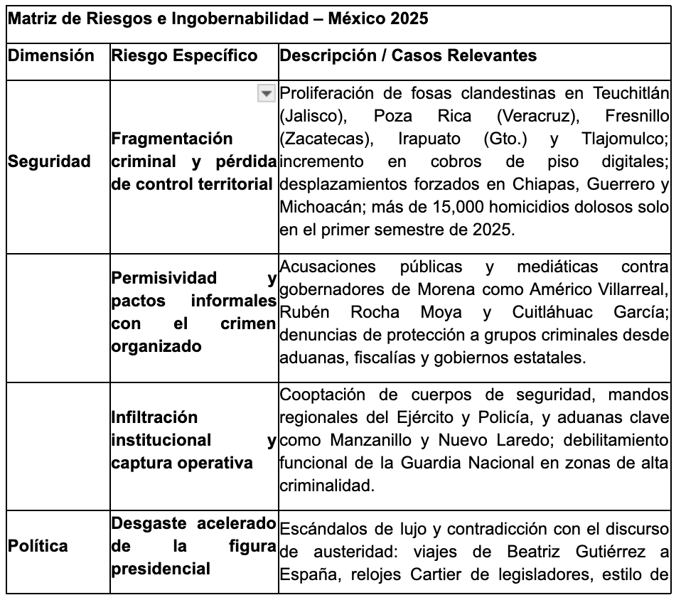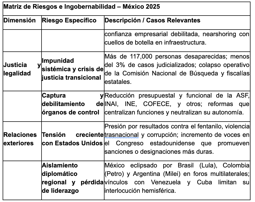 En conjunto, estos eventos profundizan la percepción de impunidad estructural y colapso normativo en los círculos económicos, tanto nacionales como internacionales, y refuerzan la idea de que el riesgo de hacer negocios en México ha dejado de ser coyuntural para convertirse en sistémico.
