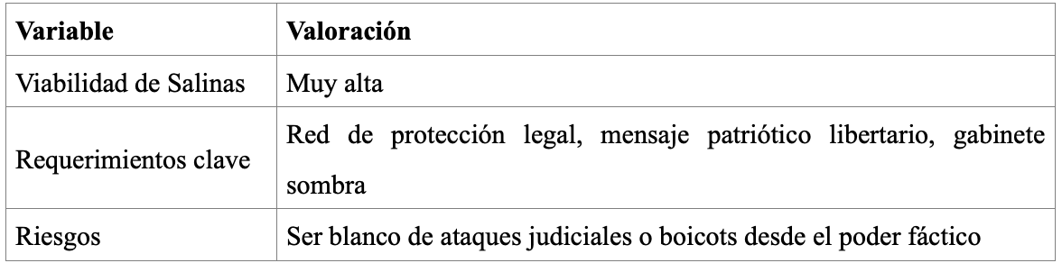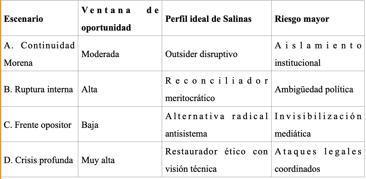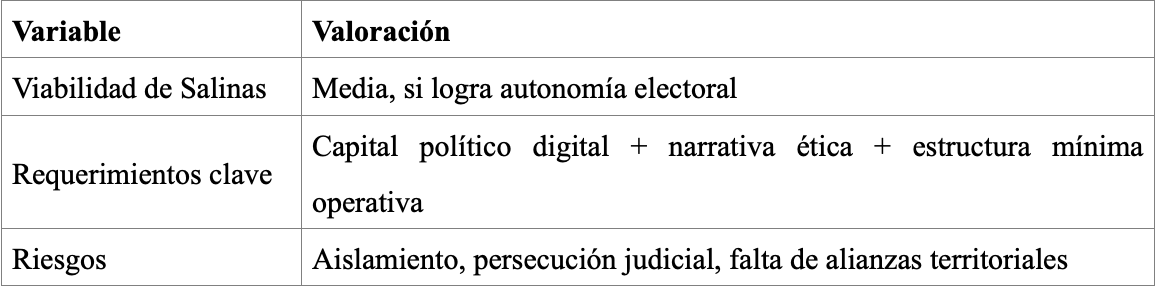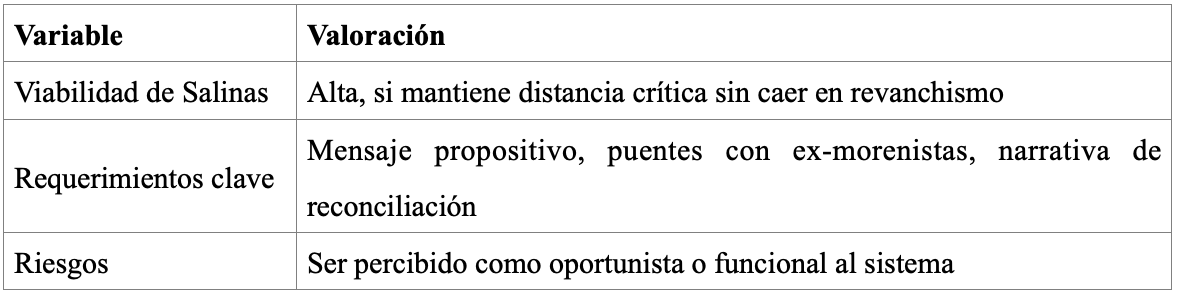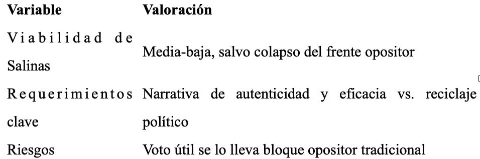 Oportunidad para capitalizar la desilusión oficialista y absorber al votante pragmático decepcionado. Salinas podría ser visto como “la oposición no ideológica” que ofrece orden, innovación y libertad frente al caos interno del régimen.