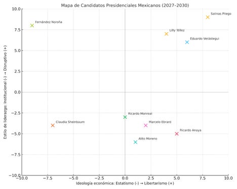 Gráfico 1: Ubicación de Salinas, Bukele, Anaya, Ebrard, Noroña, Verástegui, Monreal, Alito y Téllez según estos dos ejes.