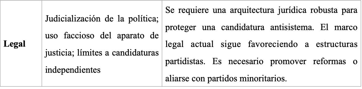 Regulación electoral y medios: El sistema electoral limita tiempos y formatos de campaña fuera de partidos. Se requerirá una narrativa de legitimidad social previa.
