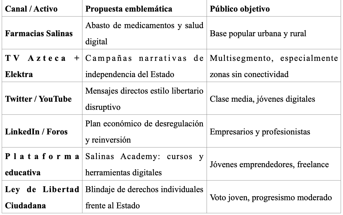 Para que Ricardo Salinas Pliego consolide una candidatura viable y competitiva rumbo a 2027 o 2030, se requiere una estrategia de posicionamiento que combine su perfil empresarial, tecnológico y libertario con una narrativa ciudadana y cercanía con la gente. A continuación, se presentan propuestas diferenciadas por segmento electoral, aprovechando sus activos estratégicos y canales de comunicación:
