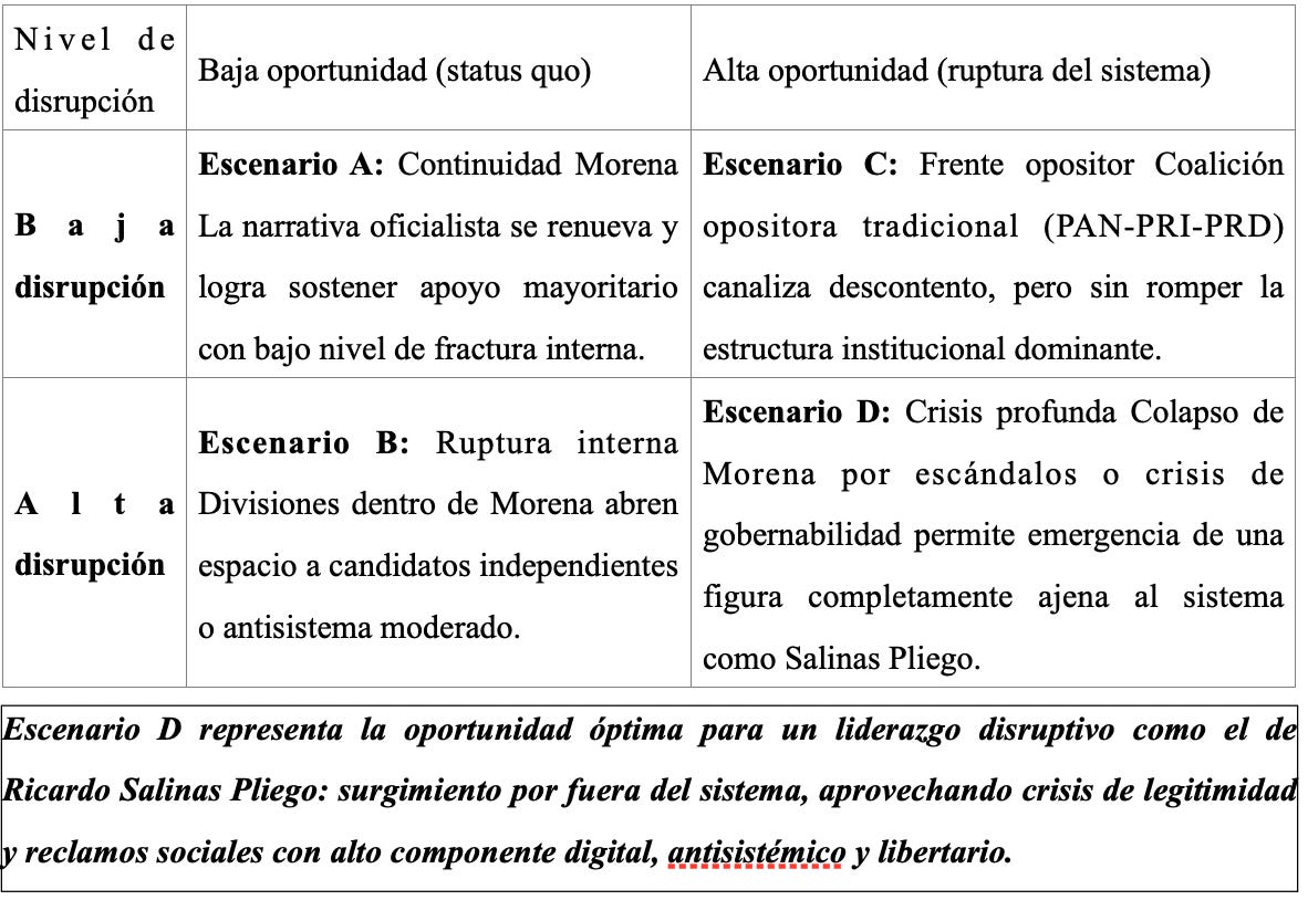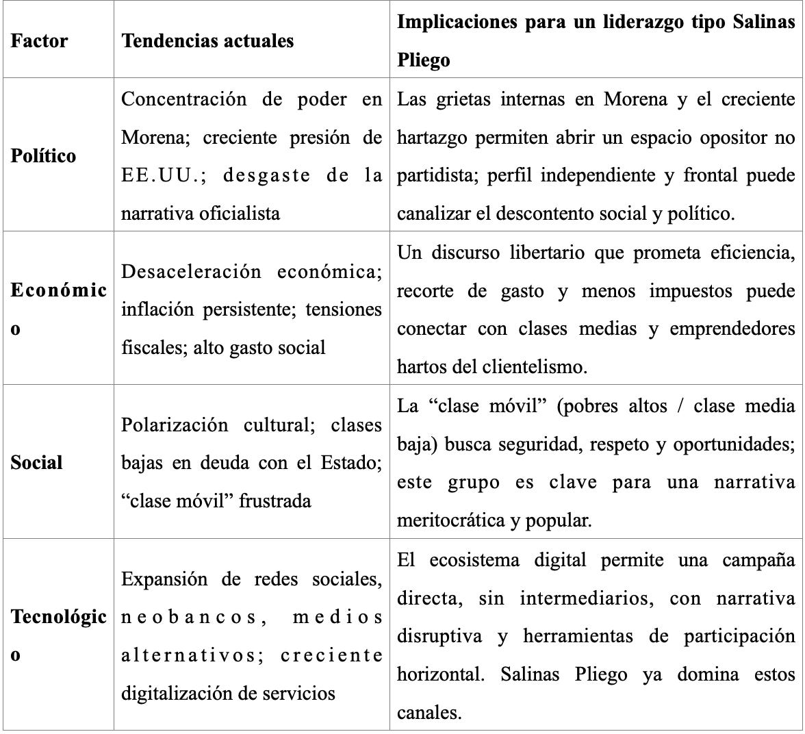 El entorno político-estratégico mexicano en 2025 está entrando en una etapa de agotamiento del modelo populista-morenista. La oposición partidista tradicional carece de legitimidad real. En este contexto, una figura como Ricardo Salinas Pliego —libertaria, tecnológicamente avanzada, antisistémica pero funcional— podría capturar una franja amplia del electorado, especialmente la clase móvil frustrada, sectores medios urbanos y núcleos digitales inconformes. Sin embargo, su éxito dependerá de construir una narrativa ética diferenciada y sortear los obstáculos legales que bloquean las candidaturas por fuera del sistema de partidos.