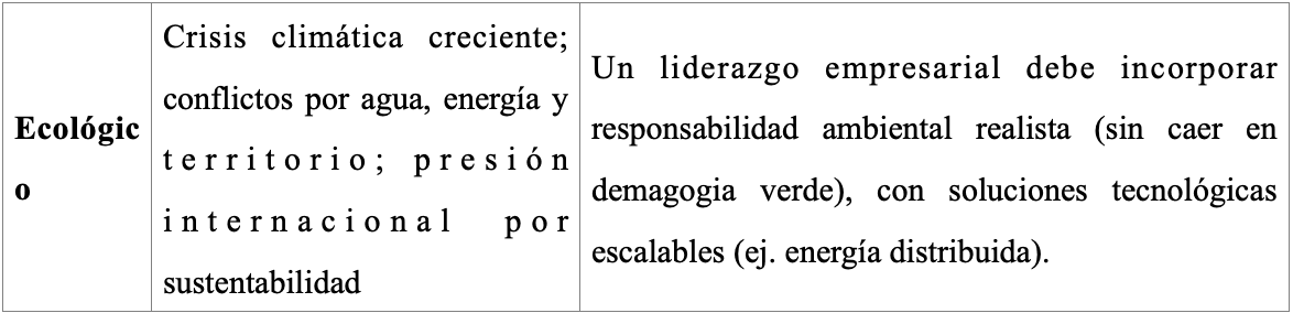 El análisis PESTEL permite identificar las condiciones estructurales —más allá de las preferencias del electorado— que configuran el espacio de posibilidad para una candidatura presidencial disruptiva. Este modelo analiza seis dimensiones clave: Política, Económica, Social, Tecnológica, Ecológica y Legal.