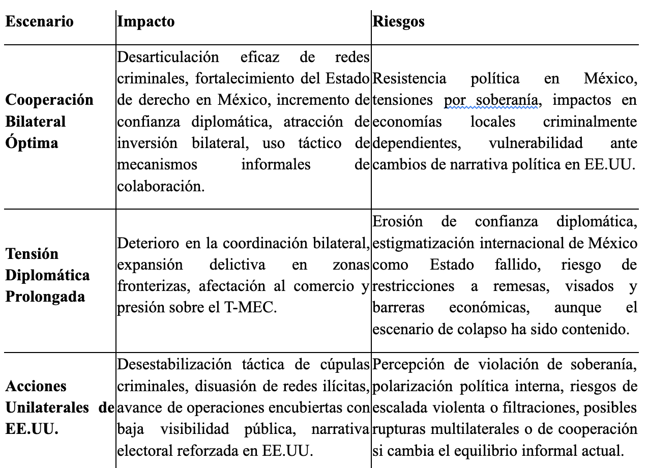 Este nuevo análisis evidencia que los escenarios deben ser dinámicos y sensibles a una coyuntura altamente volátil, donde la retórica electoral, los flujos migratorios, el control energético (como el huachicol) y la narrativa de seguridad hemisférica están profundamente entrelazados con el combate a los carteles.