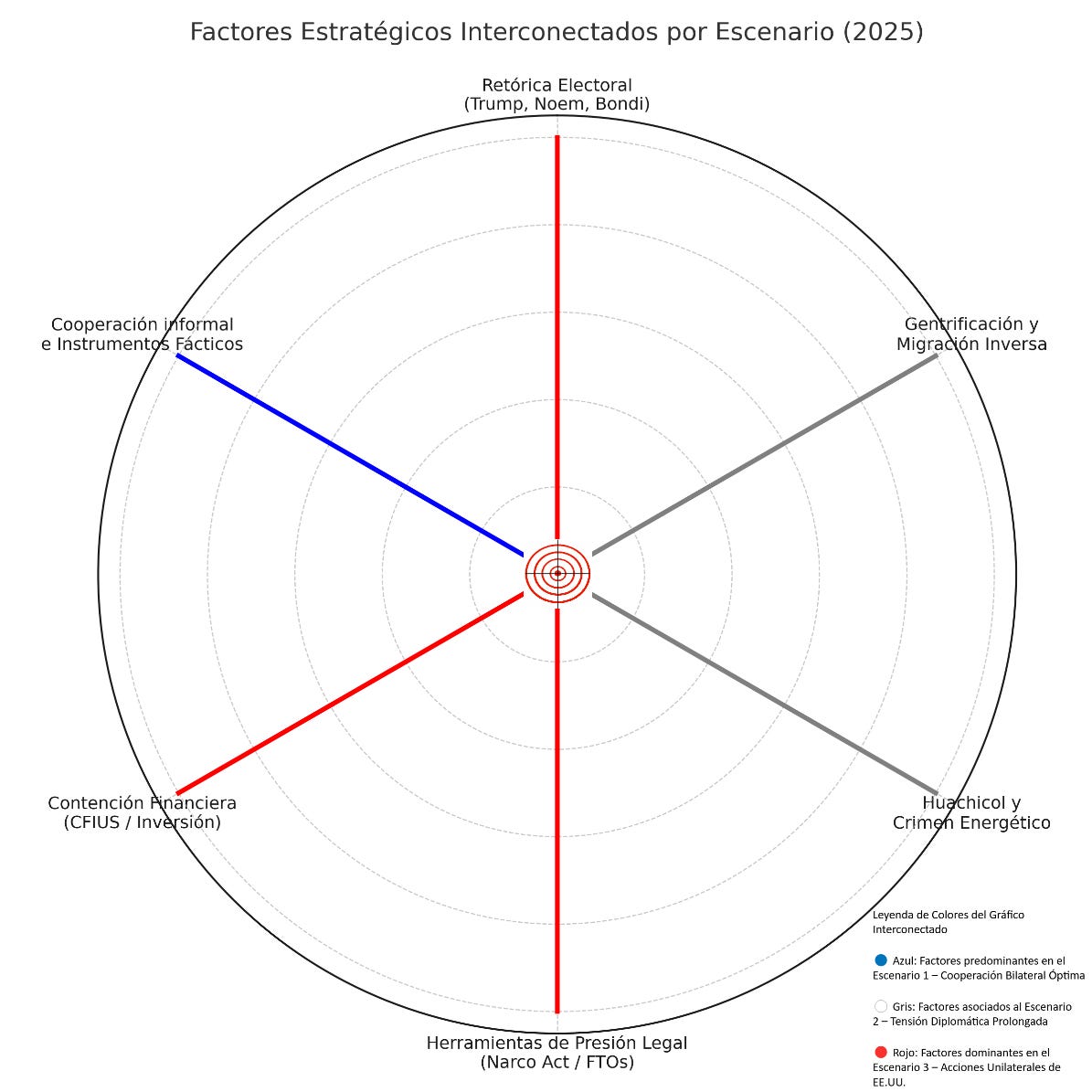 Para comprender mejor los factores que están configurando la política bilateral entre México y Estados Unidos en 2025, se presenta el siguiente gráfico de radar. Este ilustra cómo diversos elementos interrelacionados —desde la retórica electoral en EE.UU. hasta los temas de crimen energético y presión financiera— convergen sobre la seguridad hemisférica:
